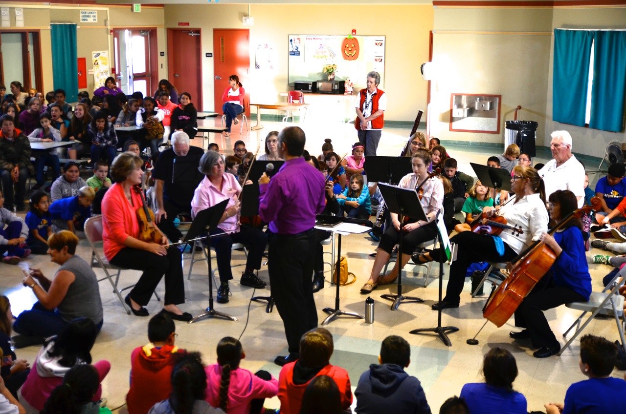 In addition to the family concert, the season also introduced the DSO’s Music For The Schools program. Originally spearheaded by Rosemarie Krovoza and Tim Meals, this program brings orchestra members into schools to give live performances and demonstrations of orchestral instruments in support of music education. The first “mini-concert” was presented at an assembly held at Westwood Elementary in Concord on October 24, 2014, with El Dorado Middle School 6th graders also in attendance. Ten musicians from the Diablo Symphony talked about their instruments and performed works by Mouret and Mozart. Many children remained after the assembly to enthusiastically ask questions of the performers. Thank you to teachers Karen Ashford and Loretta McNulty for hosting this program at its beginnings!
