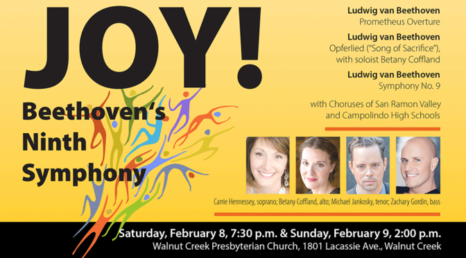 We celebrate Beethoven’s 250th birthday with a work that holds a unique place in the symphonic and choral canon: his Ninth Symphony, also known as his Choral Symphony. Join us on this remarkable journey in search of joy and unity, a journey that has resonated across countries and centuries. The musical setting of Schiller’s poem “Ode to Joy” in the final movement has become one of the most recognized melodies in all of Western music, while the text’s key line, as modified by the composer, celebrates the moment when “all men become brothers”. Almost completely deaf, Beethoven was onstage to indicate tempos throughout the premier performance and unaware of the audience’s reaction until coaxed to turn around: raised hands, with handkerchiefs and hats flying in the air, during 5 standing ovations! The orchestra will be joined by Bay Area soloists Carrie Hennessey, Soprano, Betany Coffland, Alto, Michael Jankosky, Tenor, and Zachary Gordin, Bass. Also featured are the award winning high school concert choirs of Danville’s San Ramon Valley High and Moraga’s Campolinda High.